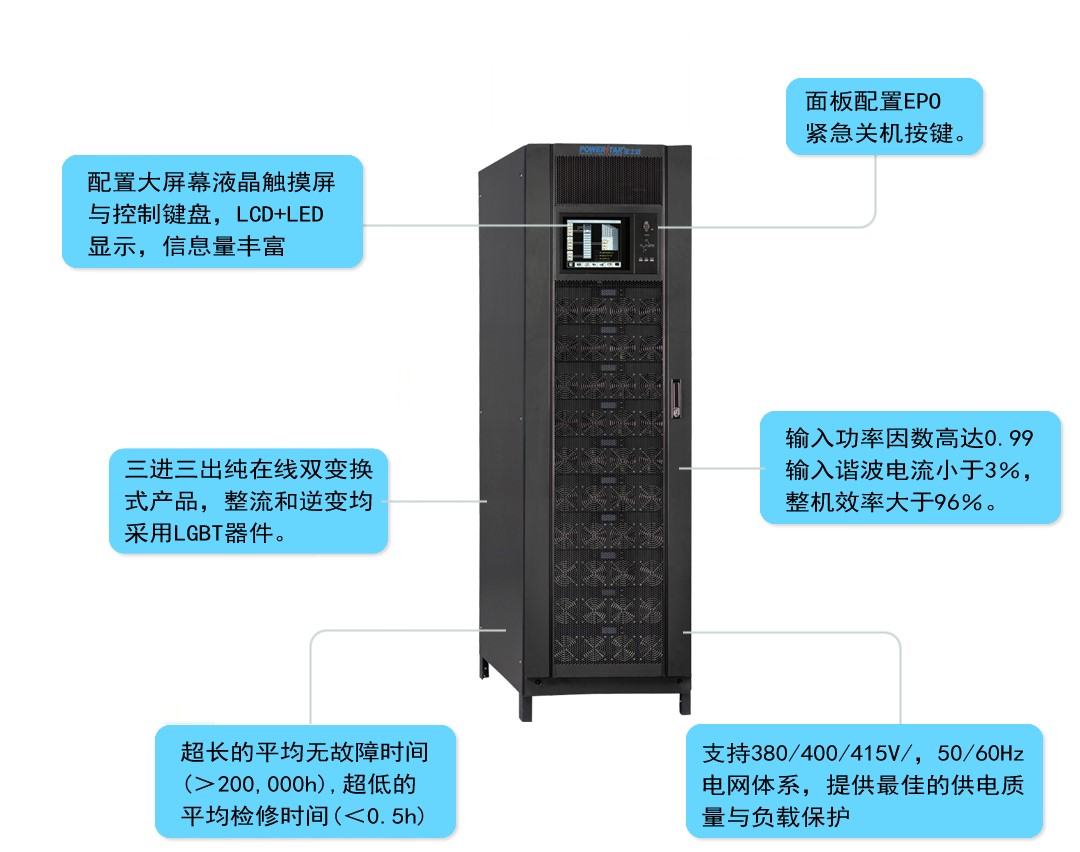 寶士達(dá)醫(yī)用高端UPS不間斷電源系統(tǒng),是為滿足電力系統(tǒng)的更高要求而設(shè)計(jì)的高可靠性產(chǎn)品。該系統(tǒng)采用獨(dú)創(chuàng)的在線式雙變換結(jié)構(gòu),三進(jìn)三出的運(yùn)行方式;所有功率半導(dǎo)體器件均采用進(jìn)口集成模塊,大大提高了系統(tǒng)的可靠性。該電源系統(tǒng)由多臺(tái)獨(dú)立的功率模塊并聯(lián),在無主同步的條件下運(yùn)行,實(shí)現(xiàn)了N+X并聯(lián)冗余備份工作,大大提高了系統(tǒng)的整機(jī)可靠性;該電源系統(tǒng)具有完善的自我檢測和保護(hù)功能、采用大屏幕帶觸摸屏LCD、圖形化操作界面、智能化的“人-機(jī)”對話菜單及遠(yuǎn)程監(jiān)測監(jiān)管功能。該電源系統(tǒng)整流器和逆變器均采用了業(yè)內(nèi)先進(jìn)的三電平技術(shù),使系統(tǒng)的效率達(dá)到96%,是目前業(yè)內(nèi)體積小、效率高、能耗比低、功率密度大的產(chǎn)品,并具有較高的性價(jià)比。