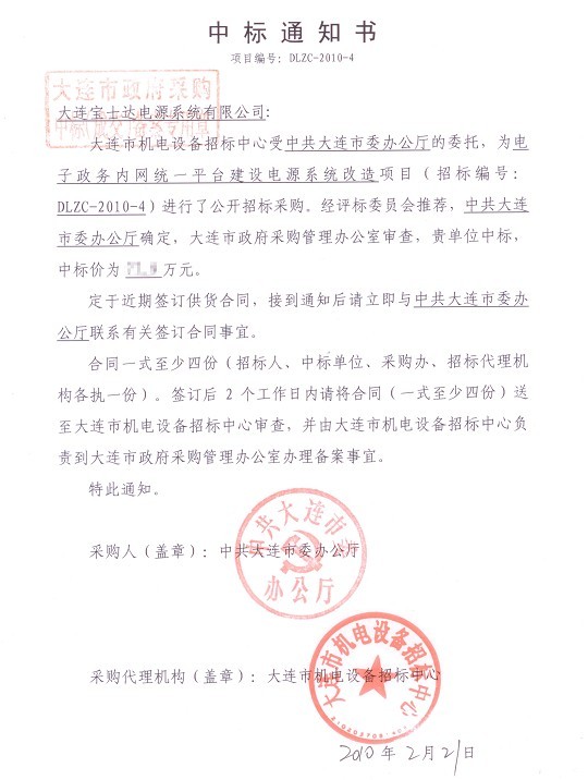 近日,大連寶士達(dá)電源系統(tǒng)有限公司成功中標(biāo)中共大連市委辦公廳電子政務(wù)內(nèi)網(wǎng)統(tǒng)一平臺(tái)電源改造項(xiàng)目,為其機(jī)房的升級(jí)改造提供安全的電力保障。