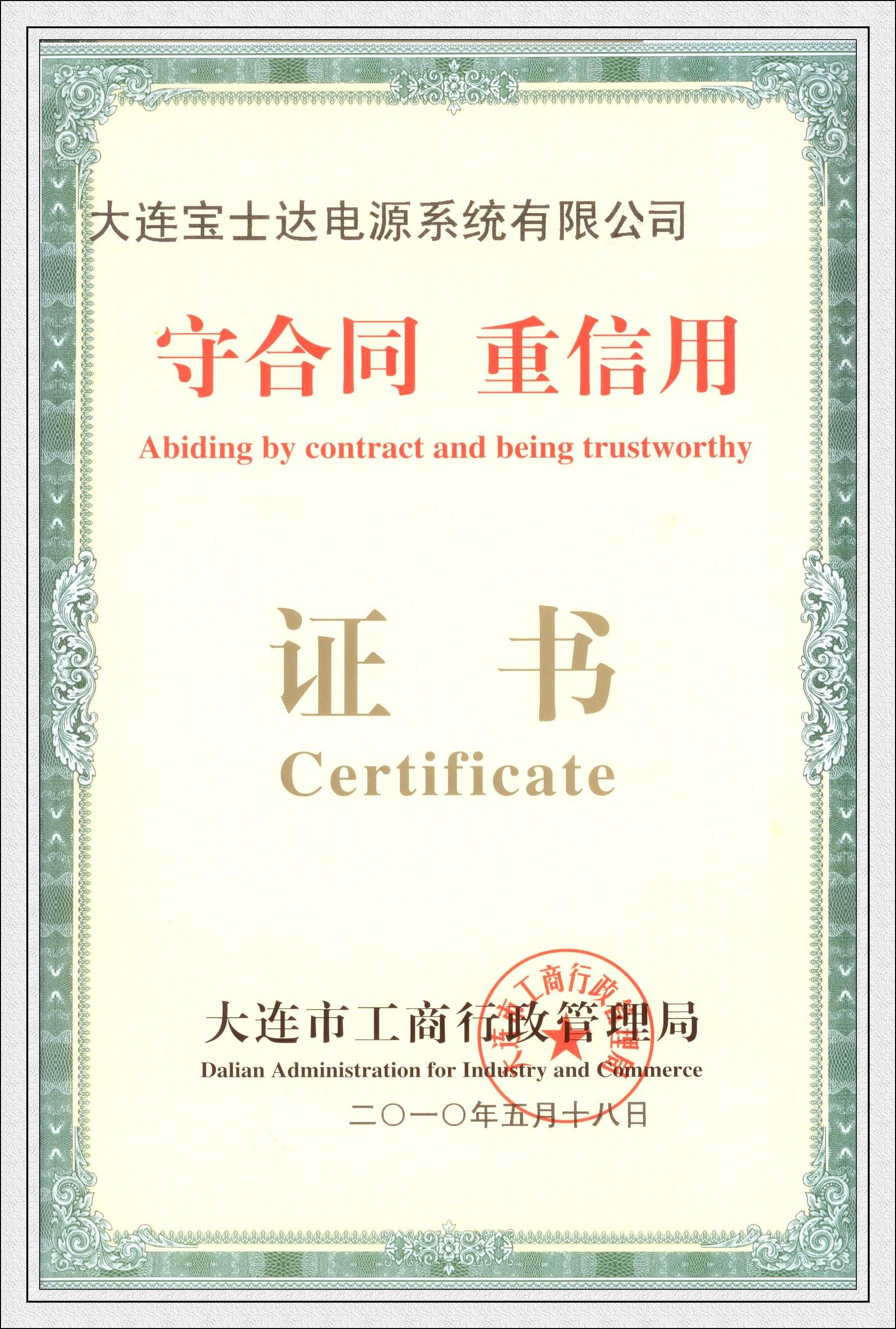 大連市工商行政管理局為表彰我公司的誠信經(jīng)營,于2010年5月18日為我公司頒發(fā)“守合同重信用單位”牌匾和榮譽證書。