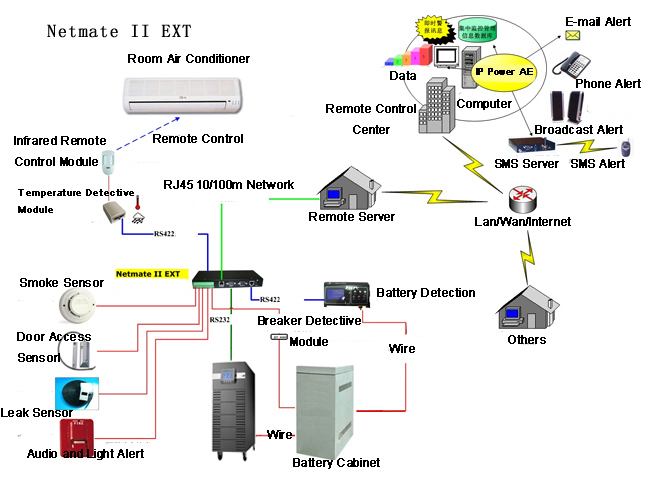 Netmate II EXT is applied for the network centralized monitoring management of small power machine room UPS resources, battery pack and its surrounding environmental conditions. It provides monitoring on temperature, humidity, the capacity of USP battery, water-leak and smoke contact. It also controls the local alarm, room air conditioner, and active the protection device.
